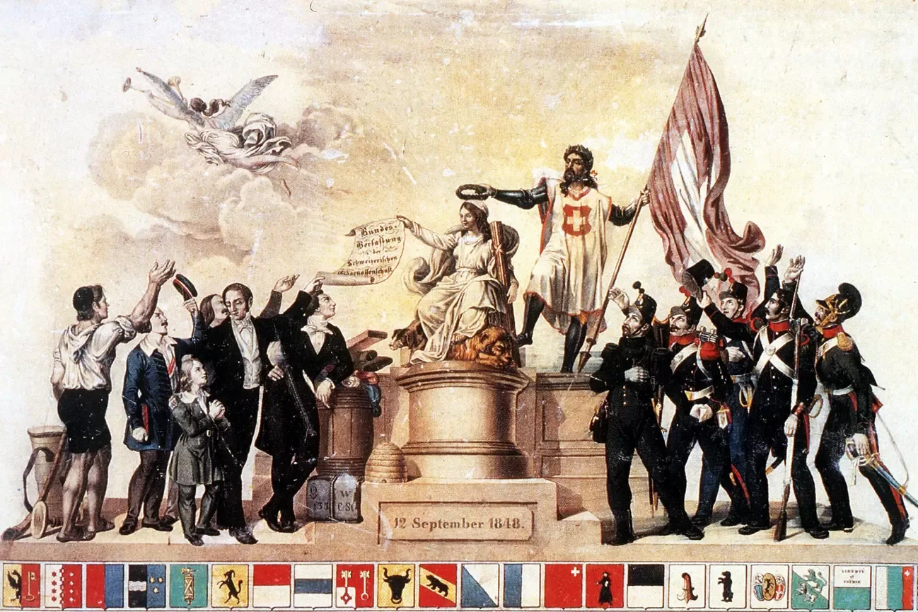 Fotolegende: Ausschnitt aus dem Gedenkblatt, das anlässlich der Einführung der Bundesverfassung vom 12. September 1848 erschien. Lithografie von C. Studer, Winterthur, gedruckt von J.J. Ulrich, Zürich (Burgerbibliothek Bern). Die in der Mitte thronende Helvetia – das Motiv geht auf die „Libertas“ des 18. Jahrhunderts zurück – wird von einem alten Eidgenossen mit einem Lorbeerkranz gekrönt und hält die neue Bundesverfassung. Auf beiden Seiten sind statt der üblichen Allegorien Bürger in Uniform und in Zivil dargestellt, die den (männlichen!) Souverän verkörpern.